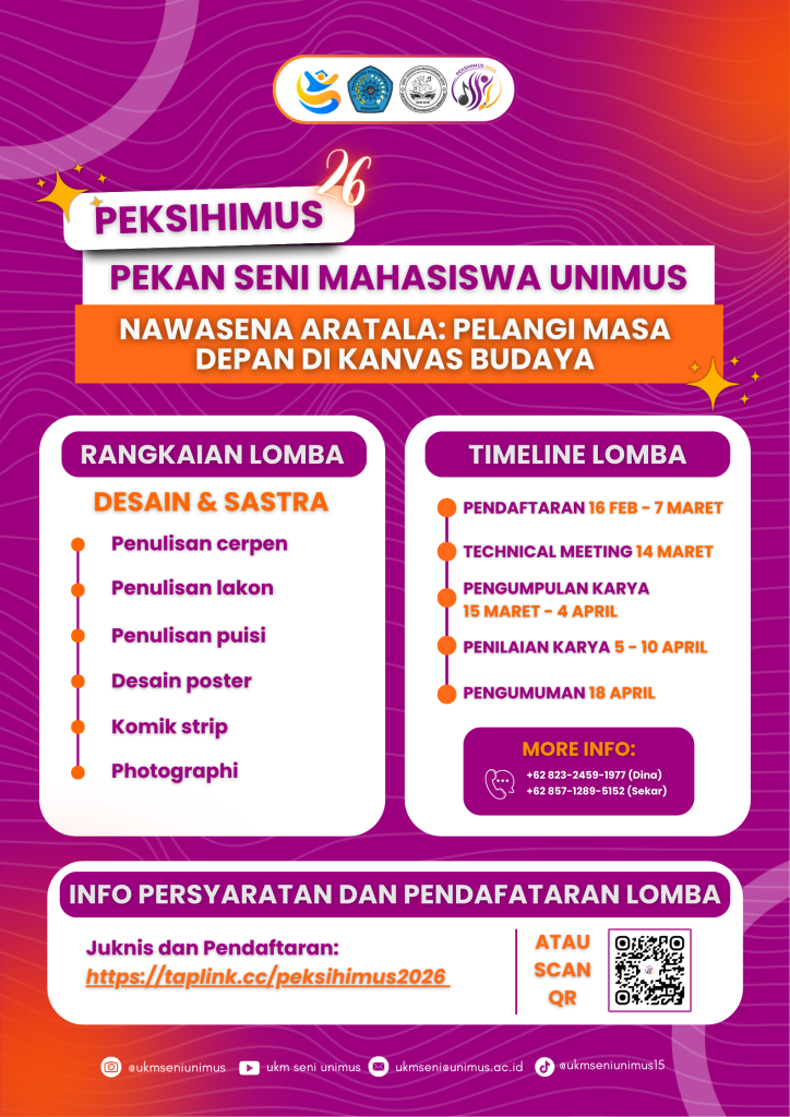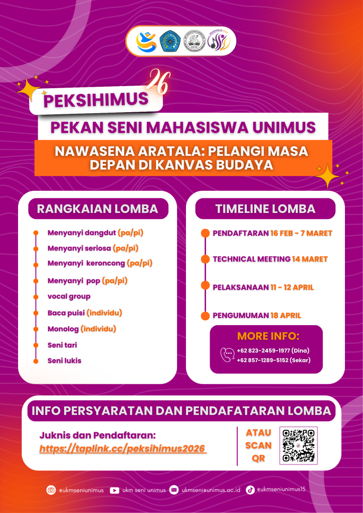 UKM Seni 2026 – Universitas Muhammadiyah Semarang (UNIMUS) kembali menghadirkan ajang kreativitas mahasiswa melalui kegiatan PEKSIHIMUS 26 (Pekan Seni Mahasiswa UNIMUS) yang diselenggarakan oleh UKM Seni UNIMUS. Kegiatan ini menjadi wadah bagi mahasiswa untuk menyalurkan bakat, minat, serta potensi di bidang seni dan budaya.